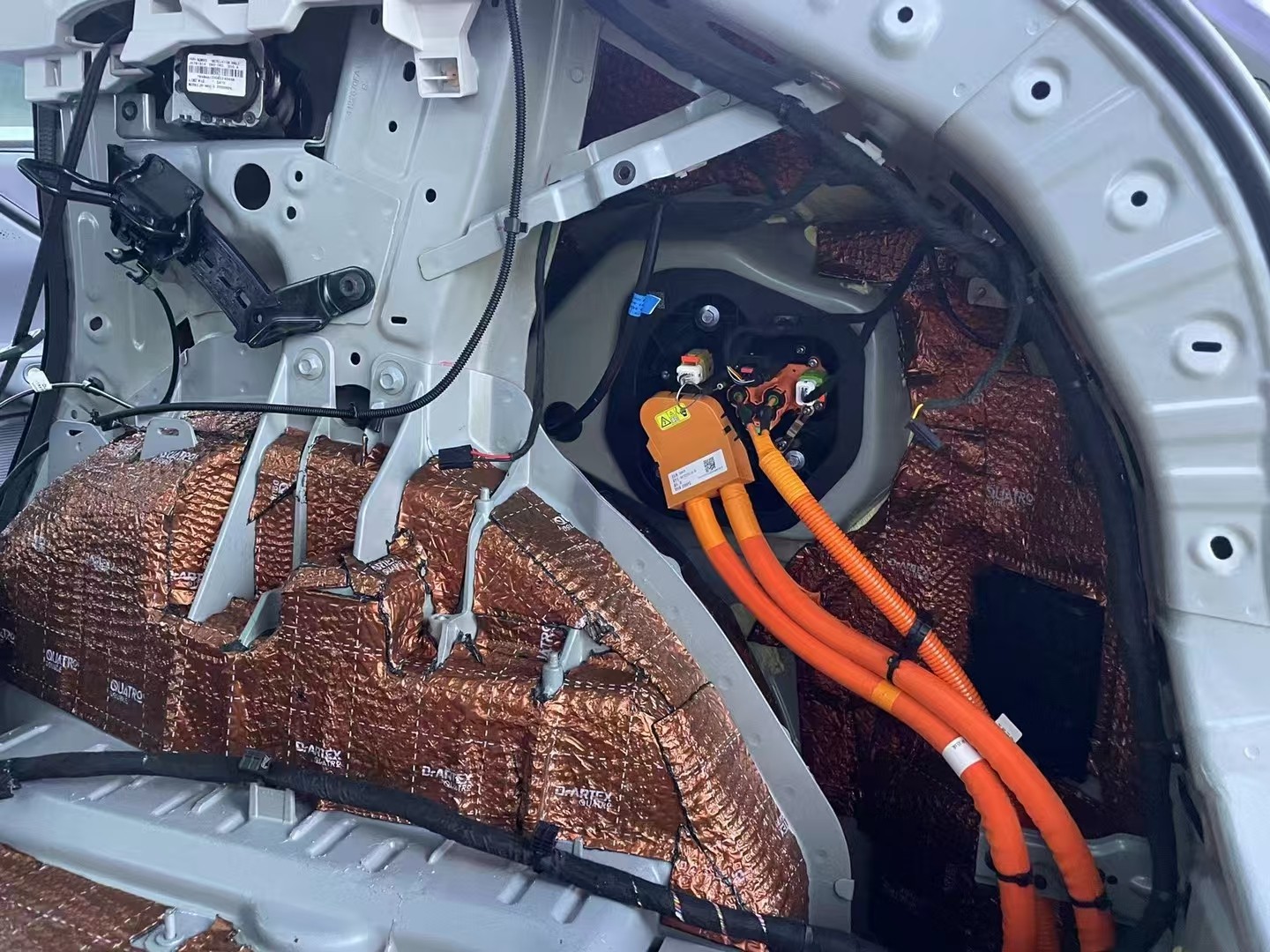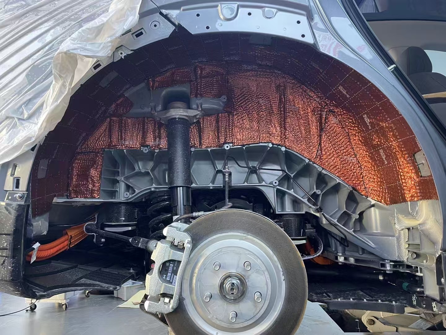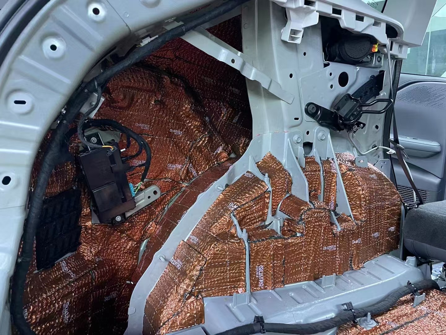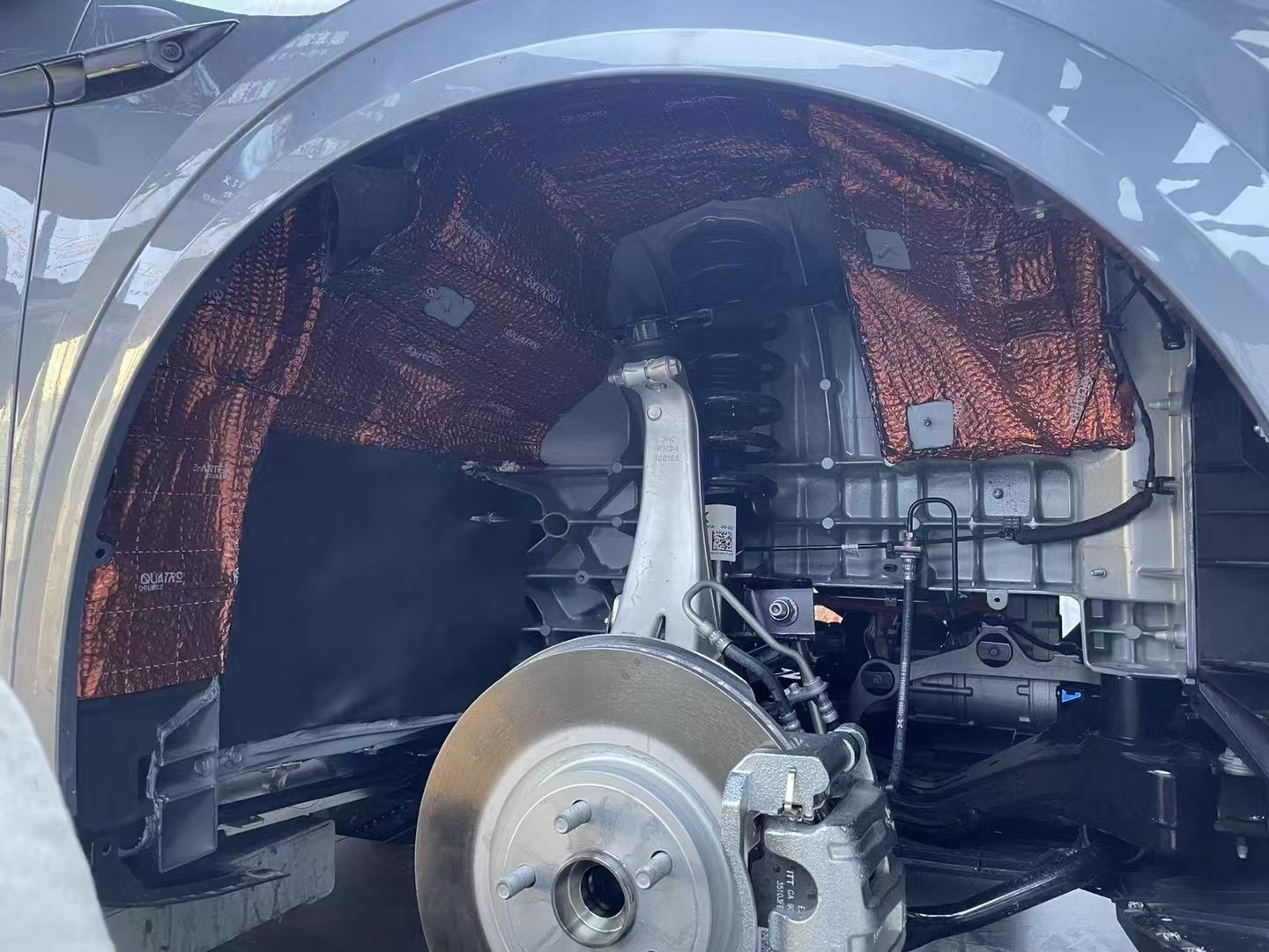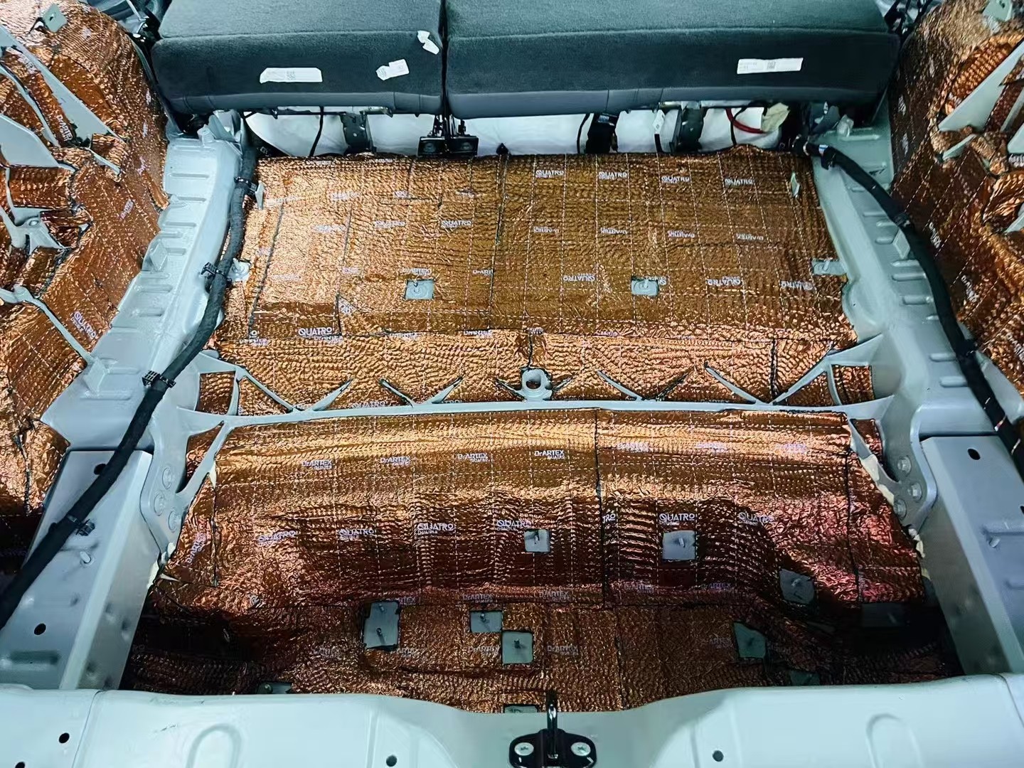 轮毂铺上俄罗斯阿德萨堡垒减振板+俄罗斯阿德萨HIFI护甲隔音棉,降低胎噪路噪,后备箱铺上俄罗斯阿德萨堡垒减振板,来自后备箱的噪音(如行李晃动声、路噪等)得到减弱,使得车内环境更为安静。