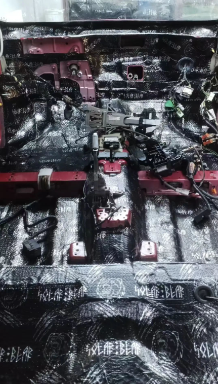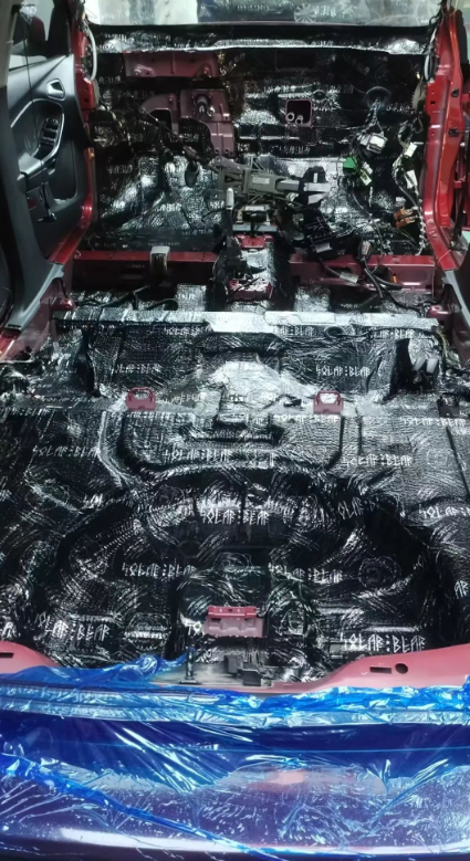 对车内的底盘、后备箱、防火墙等部位铺上俄罗斯北冰熊减振板,通过隔音材料和施工技术,针对这些噪音源进行多层次的隔音处理。它能够降低外界噪音,使车内空间静谧感进一步提升。
