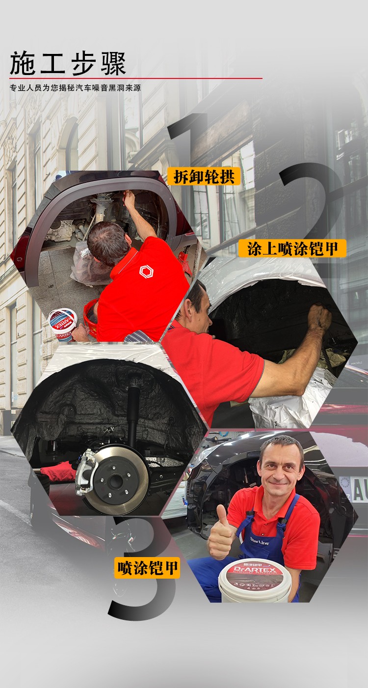 阿德萨喷涂铠甲的施工,完全不同于传统的减振隔音材料的贴覆施工。 它是将隔音胶泥先用常温的酒精稀释搅拌,然后在清理干净的汽车钣金上喷涂即可,施工简单。 这样做的好处是,强力阻尼胶泥,可以更好地附着在钣金上,不同部位厚度可调,达到更好的阻尼和减振效果。 另一个功能是,有点类似于汽车的底盘装甲,可以强化钣金,保护钣金。