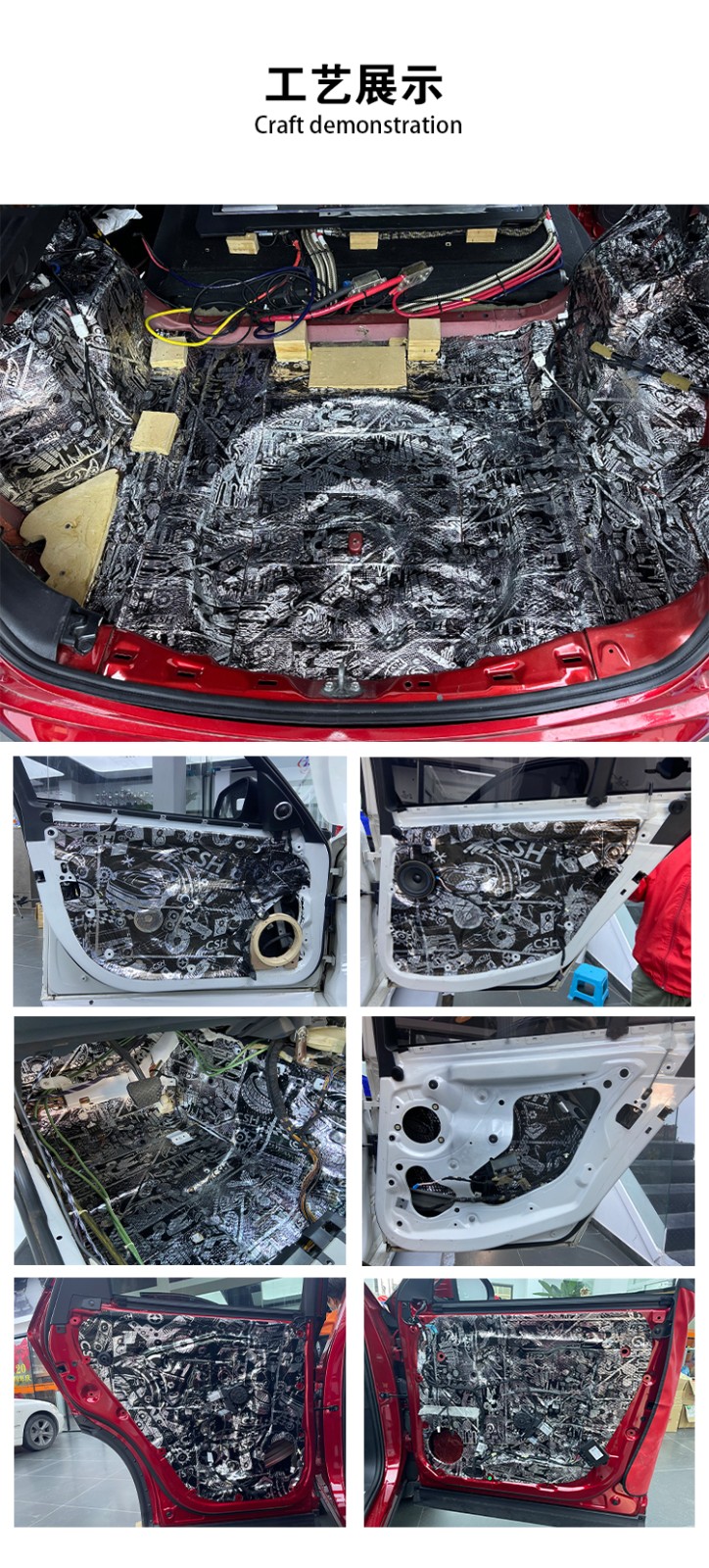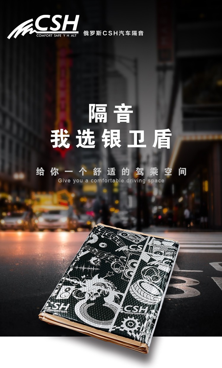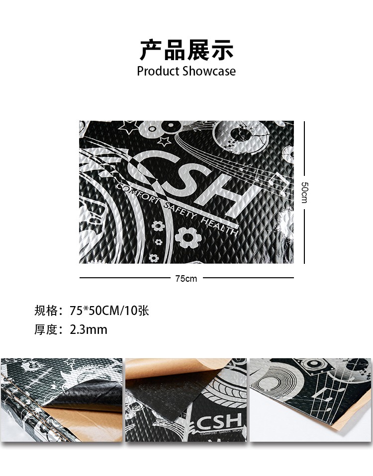 CSH Jewel Plus银卫盾:是一款灵活的防水材料,能紧密地贴合于复杂的安装面,提供良好的减振效果。 安装区域:车门、顶棚、引擎盖、车地板、尾箱和轮胎 规格:CSH银卫盾=10片*750*500mm 厚度:2.0mm 产品功能: 这款材料拥有较高的灵活性, 适用于不同的安装表面,提供良好的减振效果。这款也是防水材料,可较好地保护汽车底盘等安装面,具有防腐蚀,防氧化,防水等特性,该材料可安装于干燥、清洁的涂漆金属表面,复杂表层同样适用。操作间温度介于18-30°C之间。 储存说明: 产品需水平存放于平滑面,存放温度不超过40°C ,远离供热系统至少1米,避免水汽,油类及阳光直射,存放时垂直高度不超过1米。 安装说明: 安装前只要移除抗粘层,将剩余部分粘贴于安装面,用滚轮压实直至安装完成,避免材料和安装面产生其气泡。勿将该材料应用于不清洁,已被腐蚀的金属面上。 包装:10片x0.5mx0.75m ( 0.375㎡/片)