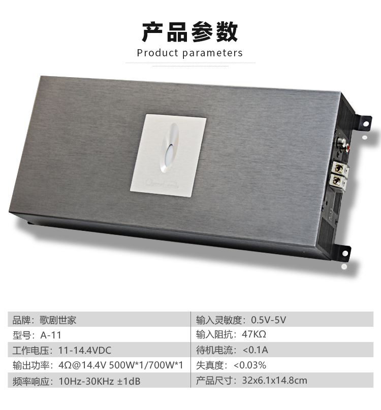 输出功率:4Ω14.4V 500W*1/ Ω 14.4V 800W*1 | 频率响应:10Hz-30KHz 土1dB 信噪比:>95dB 输入阻抗:47KΩ 输入灵敏度:1V-5V THD:<0.05%