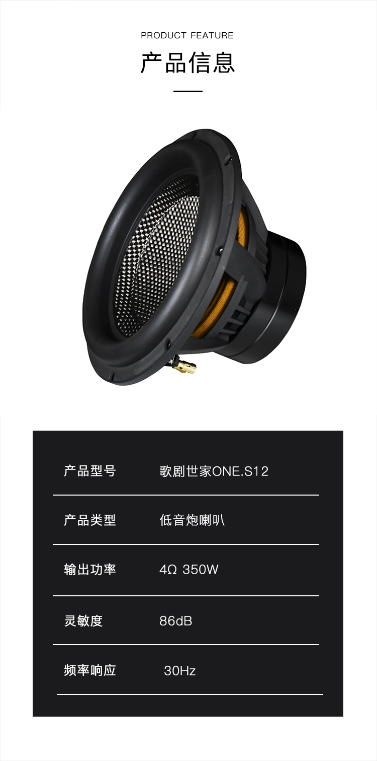 谐振频率:30Hz / 灵敏度:86dB / 系统阻抗:4Ω / RMS功率:350W