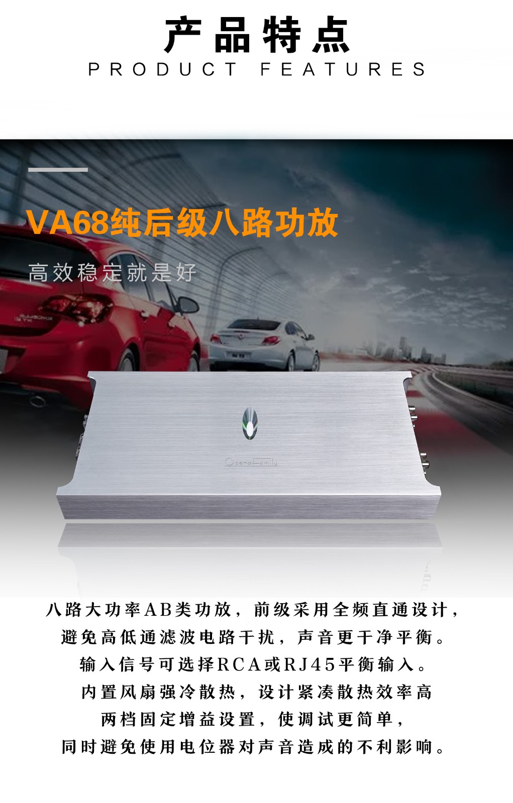 歌剧世家VA 68是一款八路功率放大器,功率为80W*8(4Ω),尺寸规格为40.1x20x4.6.