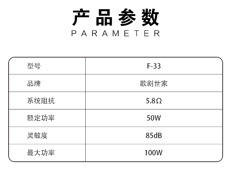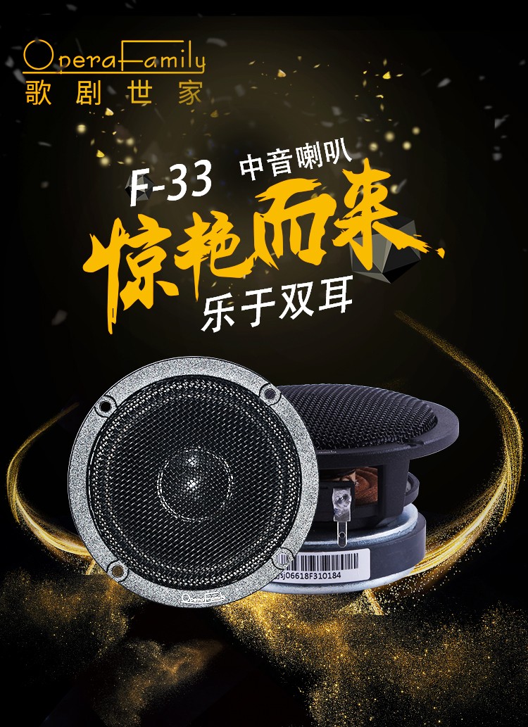 歌剧世家F-33中音喇叭:喇叭振膜采用强化聚丙烯,整体刚性强,制作工艺上不在振膜上打孔,以避免振动膜刚性受到破坏。音圈是耐热SV涂层铝管,耐热且刚性好,能量输出损失小。磁铁选用优质的锶磁。弹波使用高线性、耐疲劳的CONEX材料制成,喇叭盆架则采用合金铸铝制成,具有强防振,防扭曲能力,降低因振动引起的失真,让声音细节更加清晰、干净。 产品参数:额定功率:80W / 最大功率:120W / 灵敏度:90dB / 系统阻抗:4Ω
