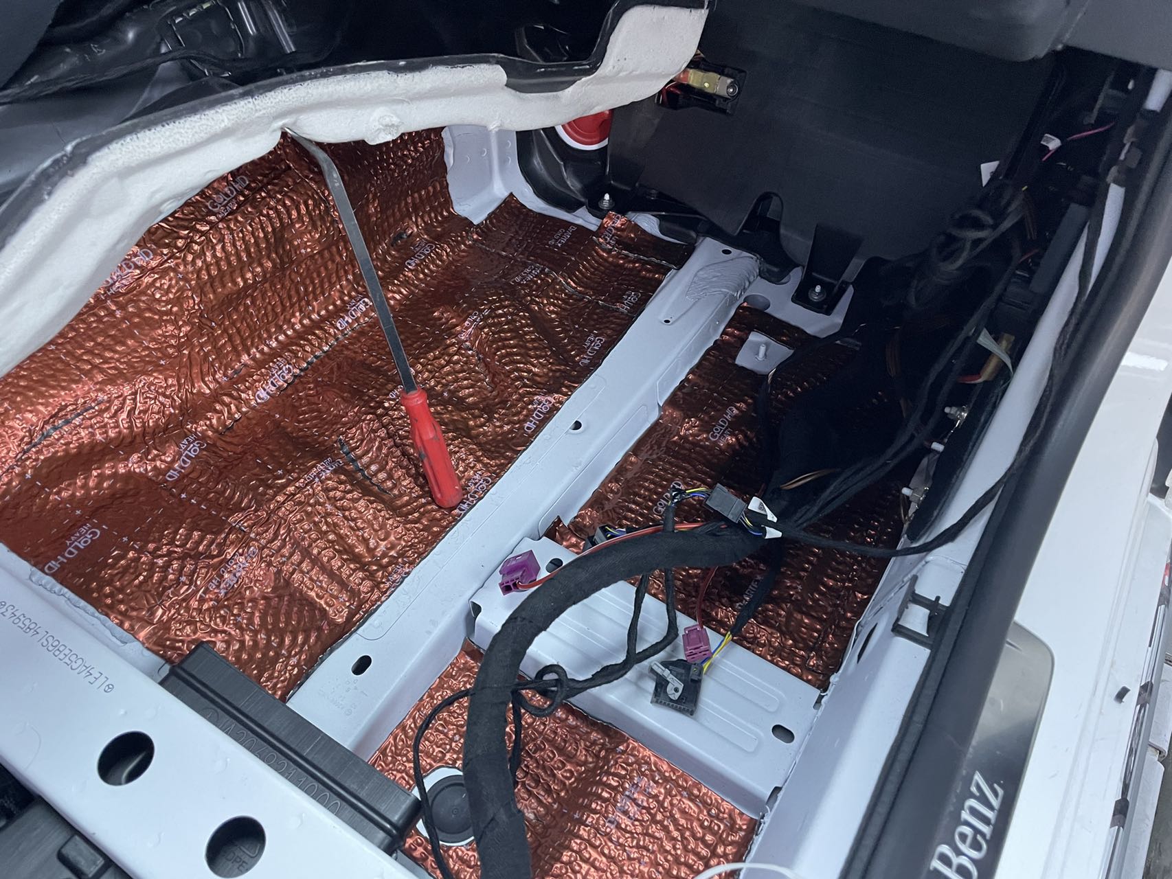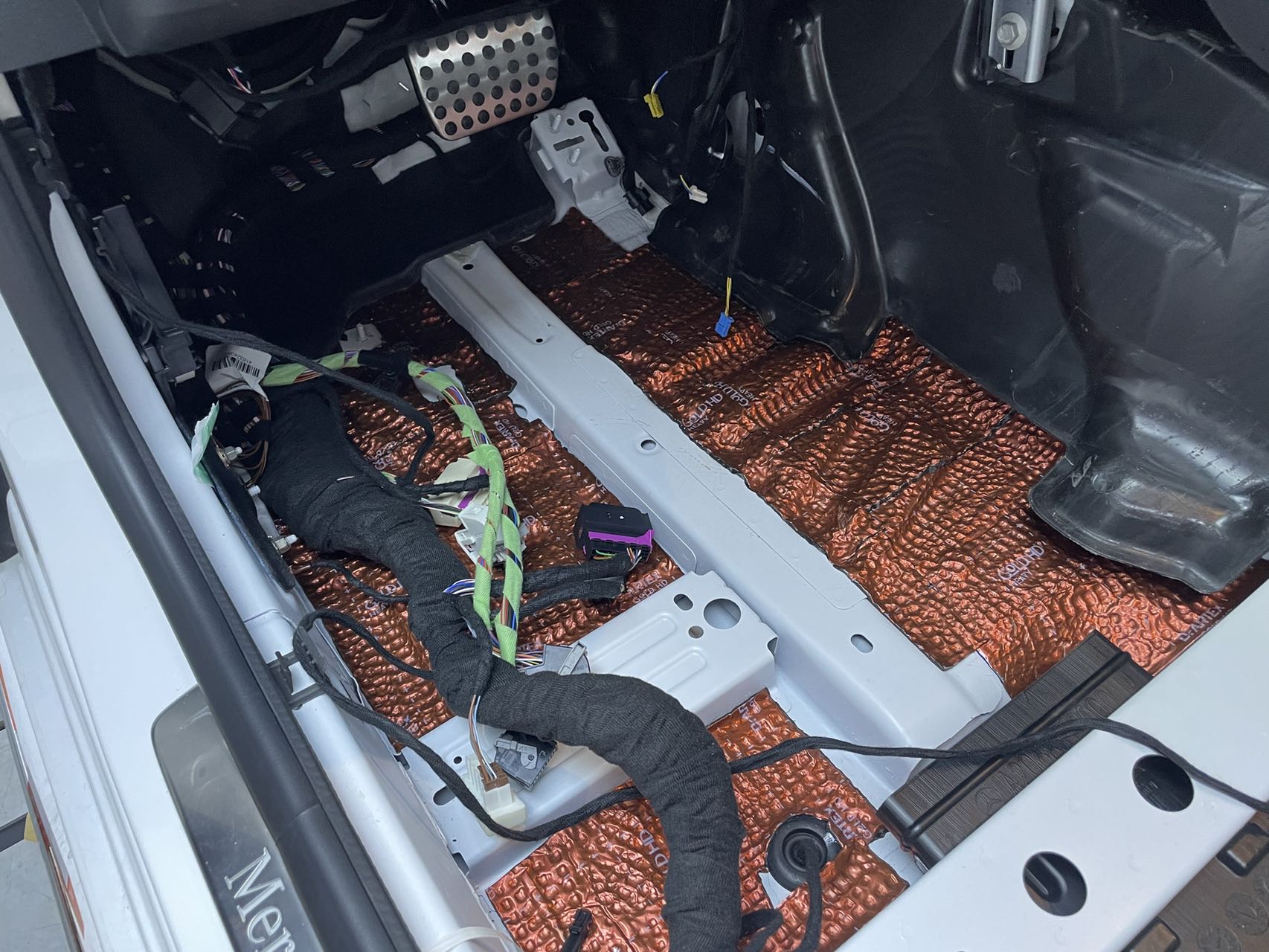 脚踏位铺上俄罗斯阿德萨金甲减振板+俄罗斯阿德萨VBB07隔音棉,脚踏位离轮胎和发动机较近,车辆行驶时,胎噪、发动机噪音、路面颠簸噪音容易通过此处传入车内。隔音处理后,可降低这些噪音。