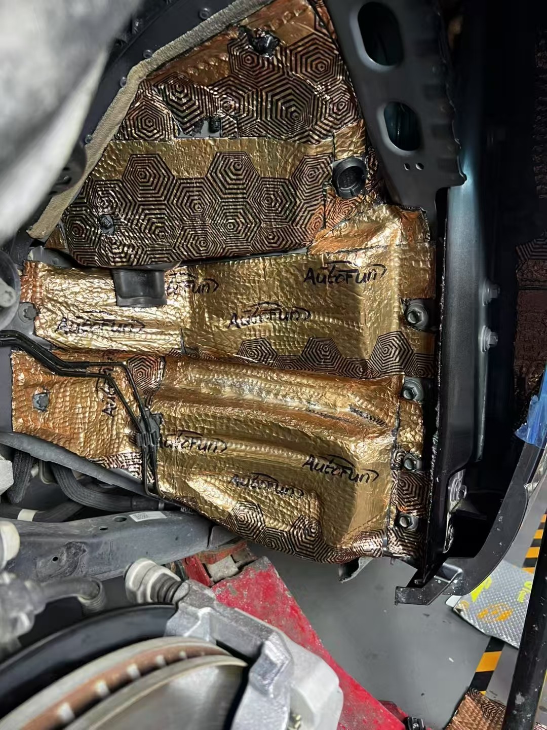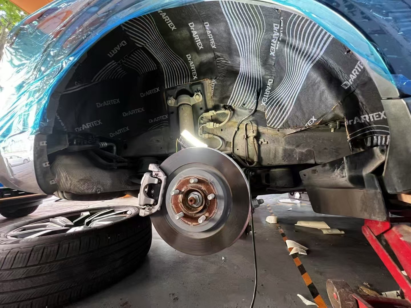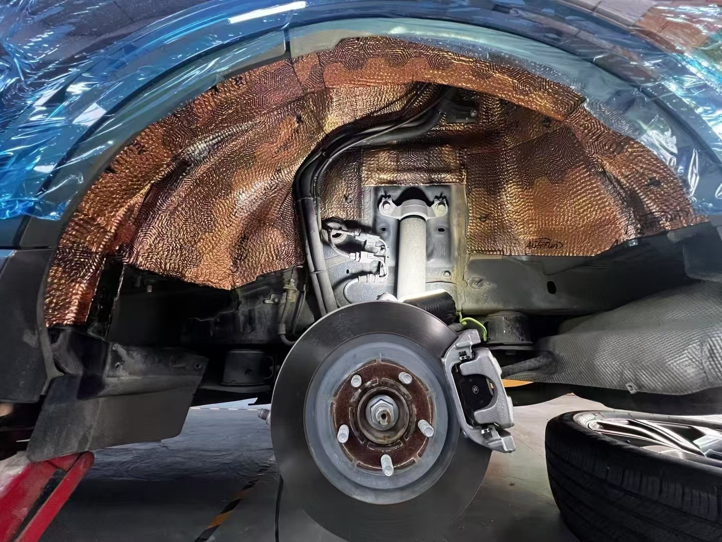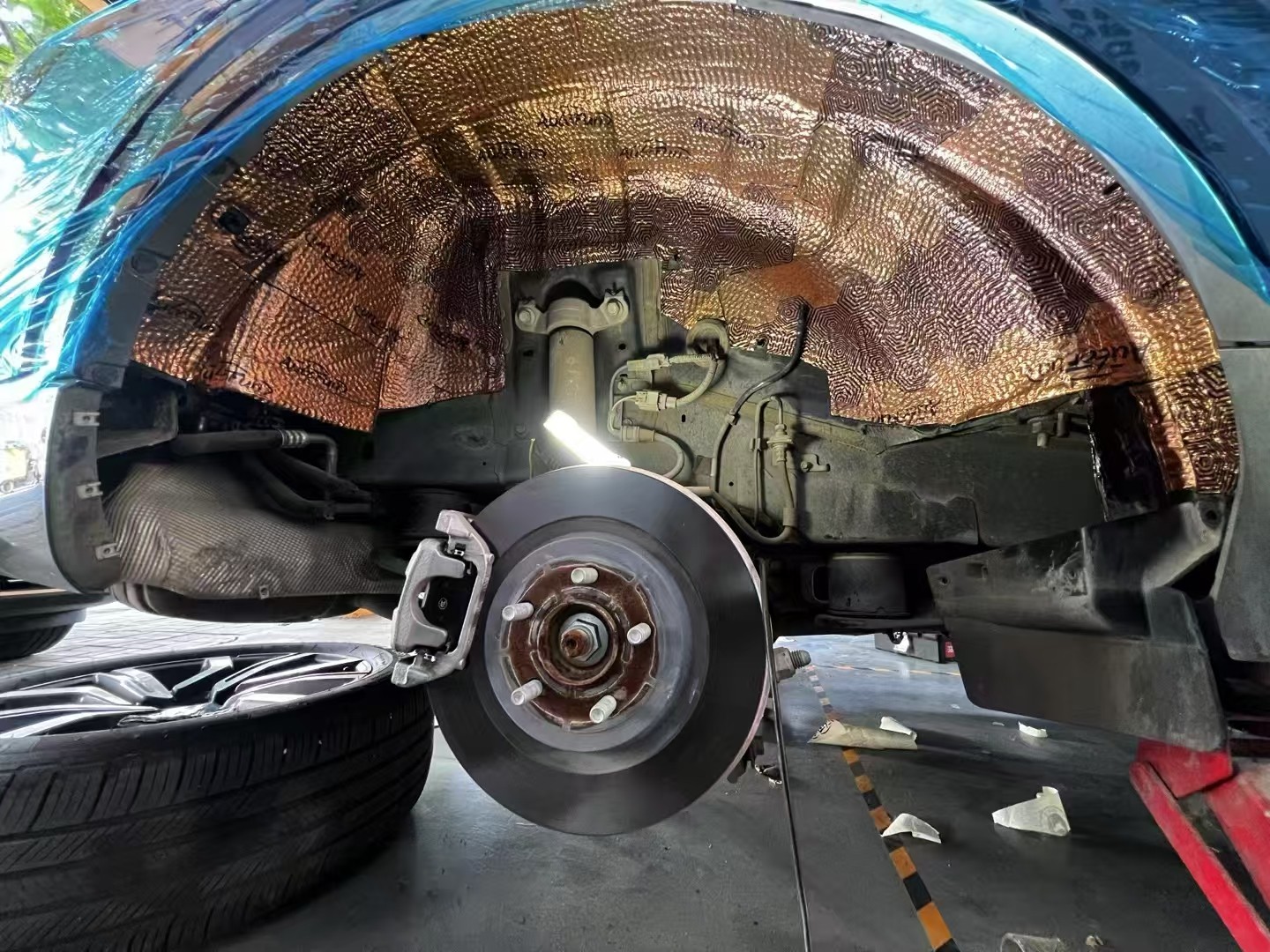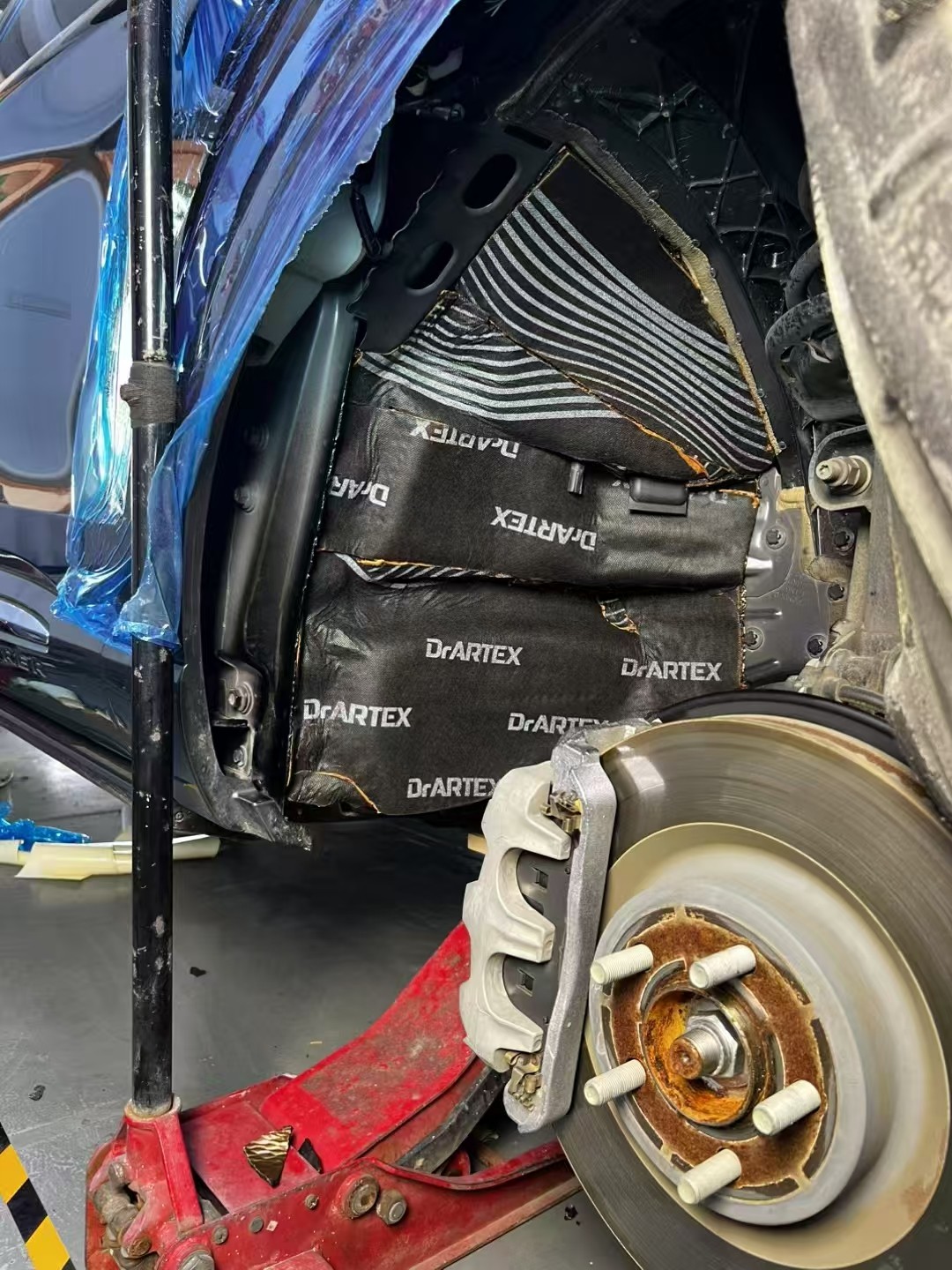 轮毂铺上俄罗斯Autofun潜艇减振板+俄罗斯阿德萨VBB07隔音棉,降低路噪、胎噪和行驶震动带来的噪音。