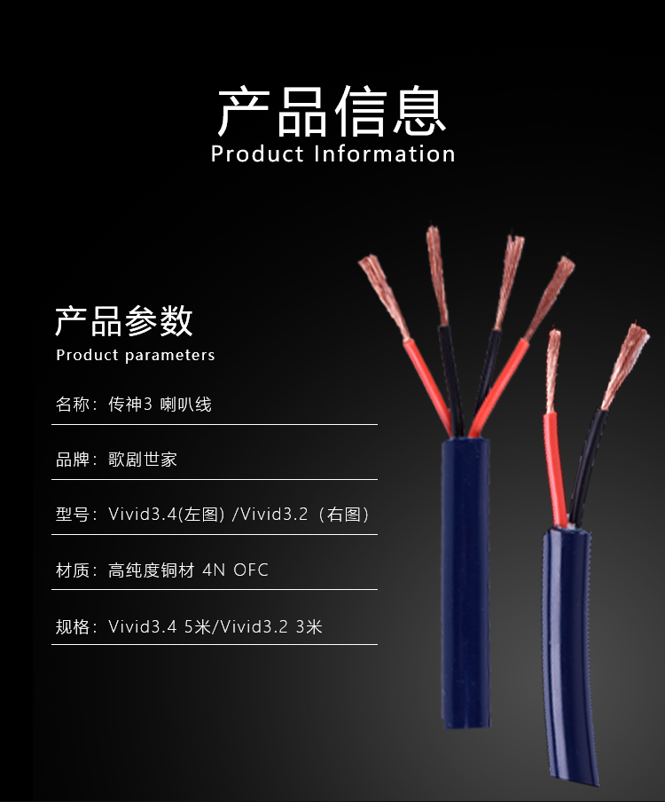 vivid 3.2 4N OFC,13#,2芯喇叭线,5米,2条/盒 vivid3.4 4N OFC,13#,4芯喇叭线,3米,2米/盒 歌剧世家vivid3喇叭线,,4N OFC纯铜多股紧密对焦传输,高纯度铜材线芯,电阻小导电性更好。 独特粗铜丝结构,提升声音传播质量,低频更强劲醇厚。
