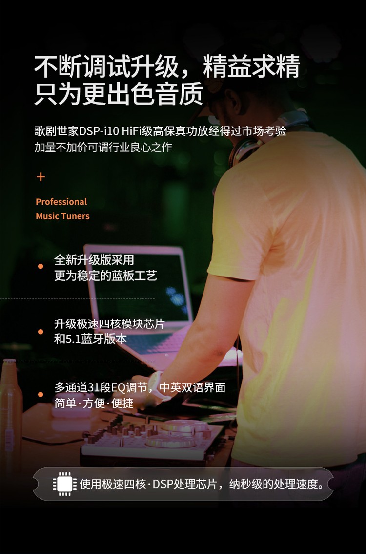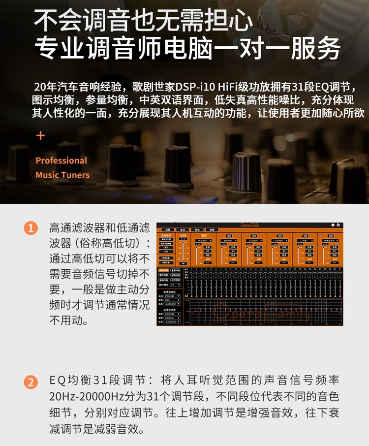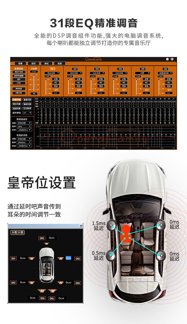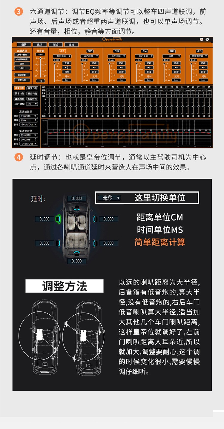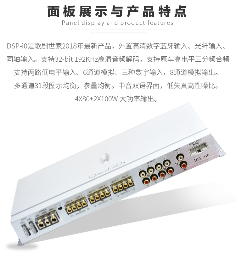 采用4组高电平喇叭线输入,4组低电平RCA输入和同轴数字音频信号输入,4X60W功率输出,48位双核CPU处理器。 6进8出,31段EQ,延时、同轴IN、4x80W+2x110W、RMS