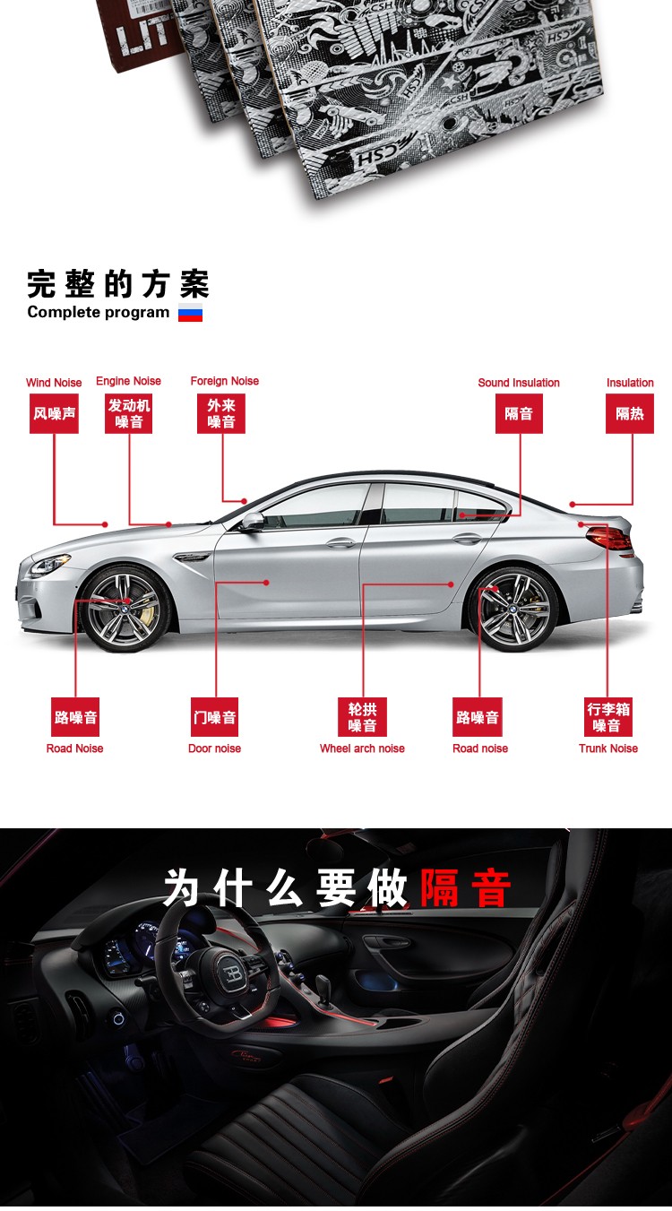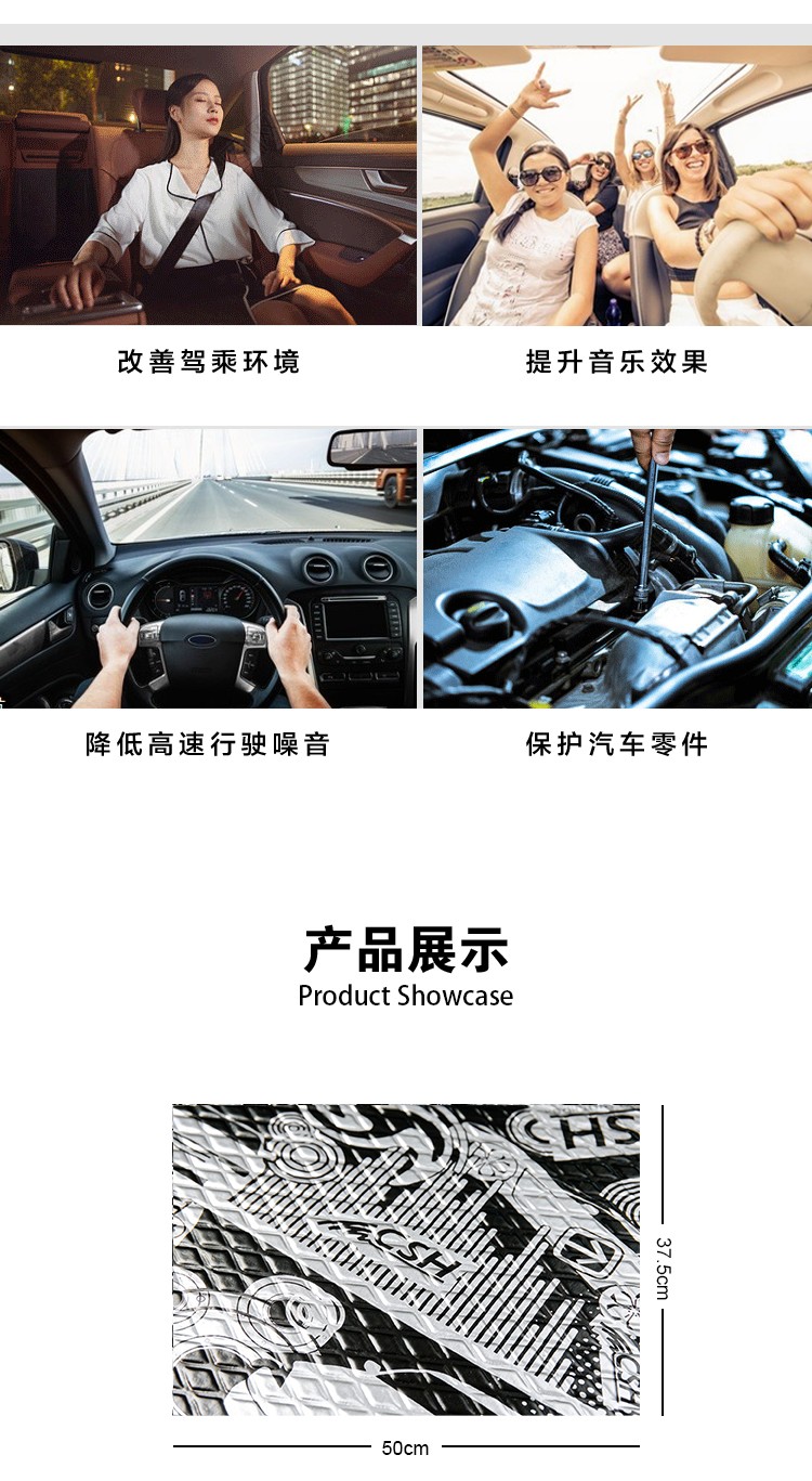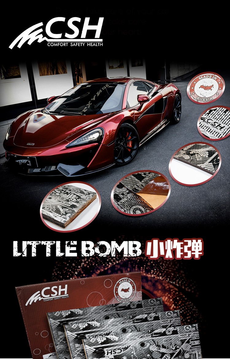 CSH小炸弹是多层结构的减振材料,包含双层铝箔,超轻巧乳香脂粘合层和抗粘层。 产品规格:CSH小炸弹=10片x50x37.5cm 厚度:3.5mm 安装区域:后尾箱、车轮拱、车地板、引擎盖