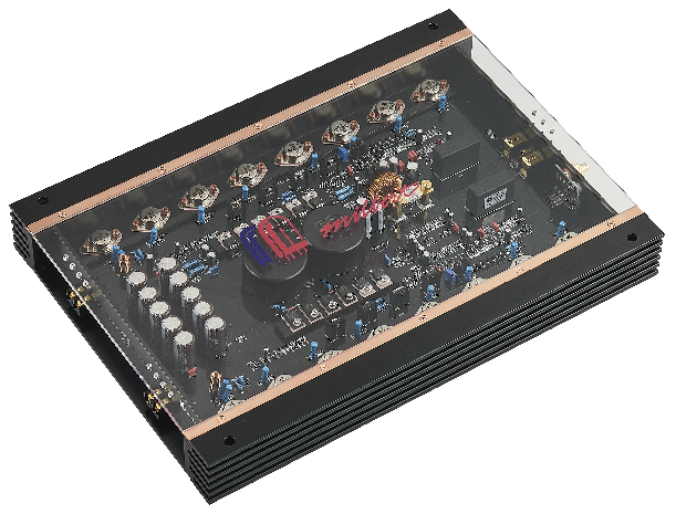 纯正的双独立单通道HI-FI车载功放,偏甲类对称设计。每通道均由独立电源供应,多级前级放大的线路设计,声音还原。4对金封功率管的后级放大,提供足够强大的功率储备和控制力,可桥接驱动低音喇叭。 A、双独立的单通道功放,由2组独立电源供电,对称电路设计。 B、专门定制的镀金RCA插头和接线柱。 C、欧洲名厂耦合电容。 D、8对配对的名厂金封功率放大管。 E、所有元件均做配对。 F、玫瑰金饰条与黑色散热铝机身的搭配 G、面板透视式设计,内置LED灯光